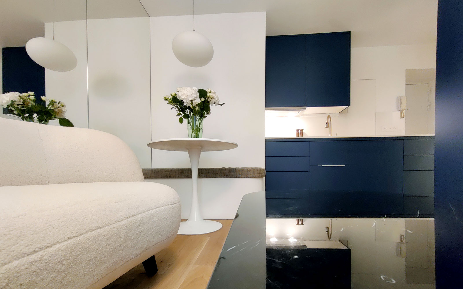 Rénovation studio Paris 17 : Dans le quartier des Epinettes, le projet de la rue Berzelius est la rénovation totale d’un petit studio de 21m2 au deuxième étage d’un immeuble sur cour. Le plan a été totalement modifié de façon à optimiser l’espace disponible. Ainsi, la cuisine créée dans l’entrée s’ouvre sur un petit salon/salle à manger de taille généreuse. La chambre de taille minimale, mais très cosy, permet de bénéficier d’une pièce de vie plus grande qu’auparavant. Reprise totale de l’électricité, de la plomberie, des sols et des murs et création d’aménagements sur mesure.